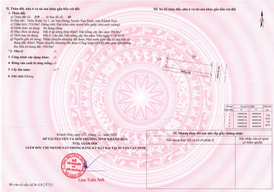 • Loại đất: Đất ở tại nông thôn 60m² + Đất trồng cây lâu năm 194.9m²