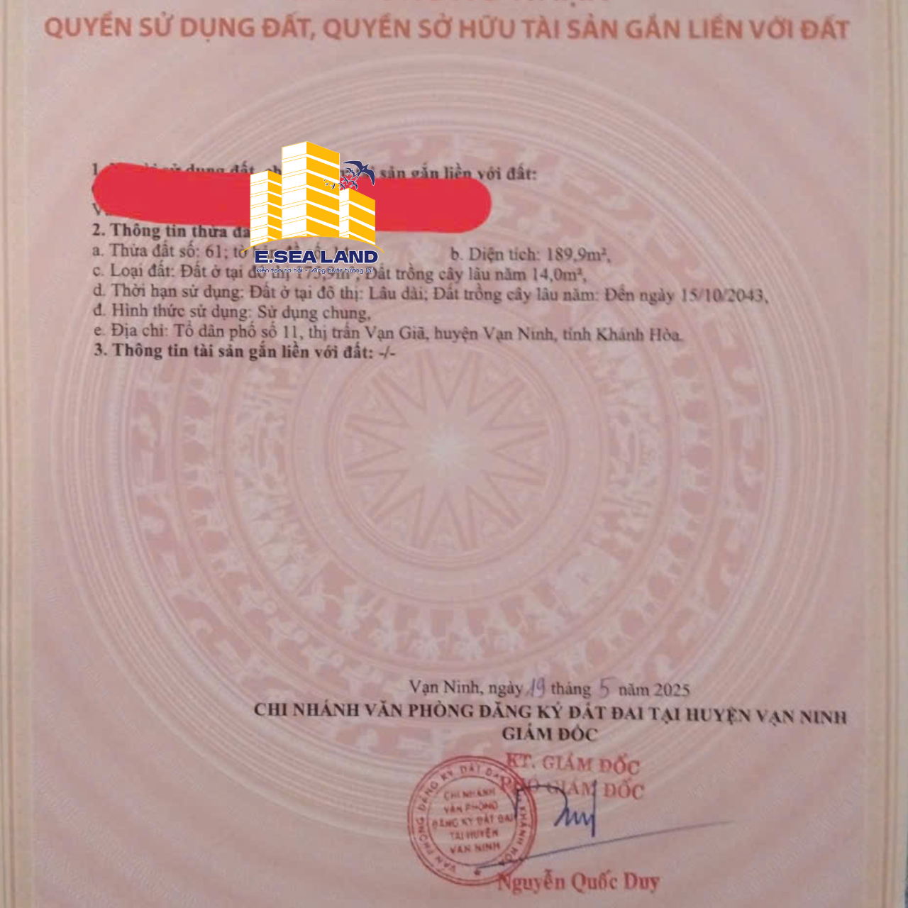 – Diện tích: 189,9 m². Trong đó: 175,9 m² đất ở đô thị (thổ cư lâu dài), 14 m² đất trồng cây lâu năm